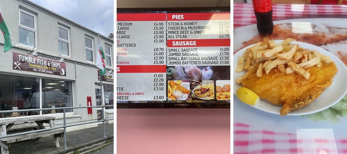 Superb!...Honestly the best fish and chips I've had in many years. Light, crispy batter and chips, no bloated or greasy feeling afterwards...mushy peas and curry sauce fantastic too. Cooked fresh and very fast while we waited. A wonderful establishment, very welcoming with a friendly family feel. I'd give it 10 stars if I could. Couldn't be better. I travel down a few times a year to Swansea and Llanelli this was my first visit and I will definitely be going back every time I'm there from now on. Easily worth a few miles drive from Llanelli. Lots of other menu choices available.